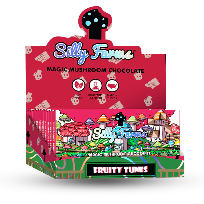 Silly Farms is delighted to introduce FRUITY TUNES, a vibrant chocolate creation inspired by the iconic taste of Fruity Pebbles cereal. This dazzling blend combines the burst of fruity flavors with the rich indulgence of premium chocolate, all enhanced with the mystical touch of Amanita Muscaria Muscimol extract. FRUITY TUNES is a tribute to the colorful, playful spirit of childhood mornings, reimagined for the sophisticated palate.