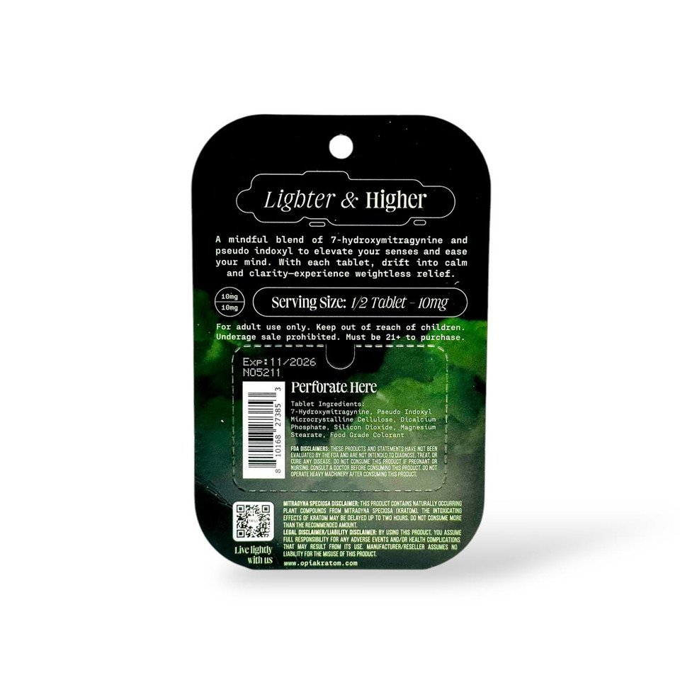 Opia Pseudo + 7OH Chewable Tablets in Spearmint flavor deliver a refreshing and effective solution to boost energy, enhance focus, and promote mental clarity while keeping you calm and balanced. Each chewable tablet contains 20mg of a precise blend of pseudoalkaloids and 7-Hydroxy, formulated for optimal cognitive and physical performance.