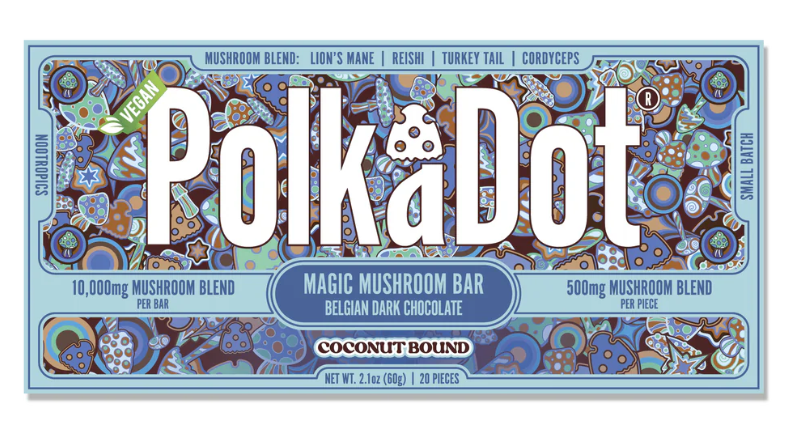 Discover the Coconut Bound PolkaDot Magic Mushroom Belgian White Chocolate—a luscious fusion of smooth Belgian white chocolate, the tropical allure of coconut, and the gentle magic of mushrooms for a truly enchanting experience.