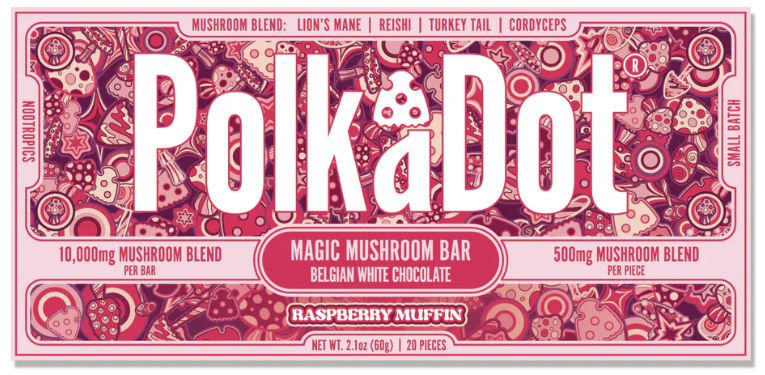 500 Mg – Proprietary Functional Organic Polka Blend• Organic Lion’s Mane (Hericium erinaceus)• Organic Reishi (Ganoderma lucidum s.l.)• Organic Turkey Tail (Trametes versicolor)• Organic Cordyceps (Cordyceps militaris)