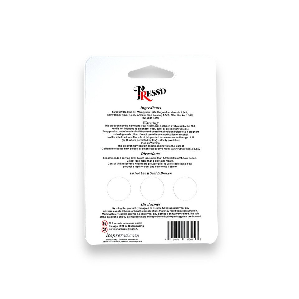 Introducing Press’D Kratom Red-OH 5X 7-OH Tablets, a powerful and concentrated form of kratom, designed for those seeking a potent experience. Each tablet contains 18mg of Red-OH Mitragynine, which is five times the strength of standard 7-OH formulations, ensuring a robust effect. The pack includes three tablets, with a recommended serving size of half a tablet, providing a total of six servings per pack. Crafted with a blend of high-quality ingredients, these tablets feature 90% Sorbitol for smooth consistency, 1.8% Red-OH Mitragynine for the active ingredient, and 1.34% each of Magnesium stearate, Natural mint flavor, Artificial food coloring, Bitter blocker, and TruSugar to enhance taste and appearance. The natural mint flavor and bitter blocker work together to create a pleasant taste profile, making these tablets not only effective but also enjoyable. Ideal for those familiar with kratom and seeking a stronger, more concentrated product, Press’D Kratom Red-OH 5X 7-OH Tablets deliver a premium experience with carefully balanced ingredients to ensure quality and satisfaction.